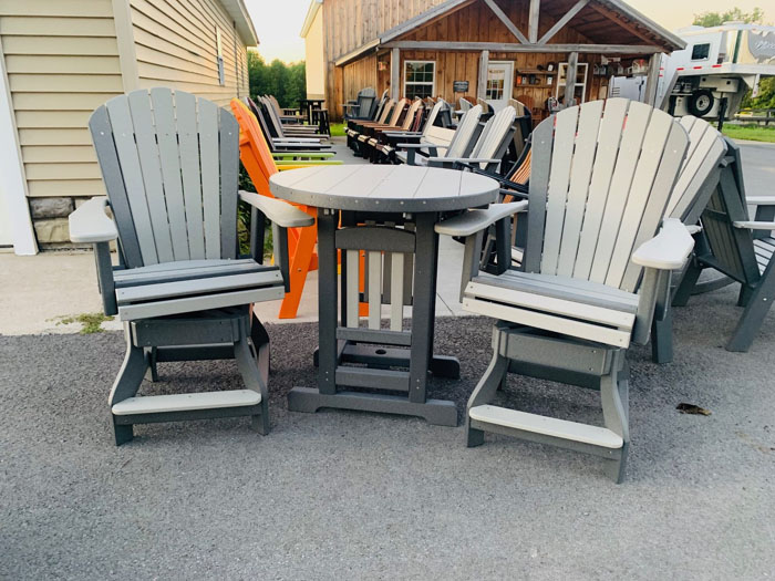 33” Round Table w Adirondack Swivel Chairs in Balcony Height, Light Gray on Dark Gray
